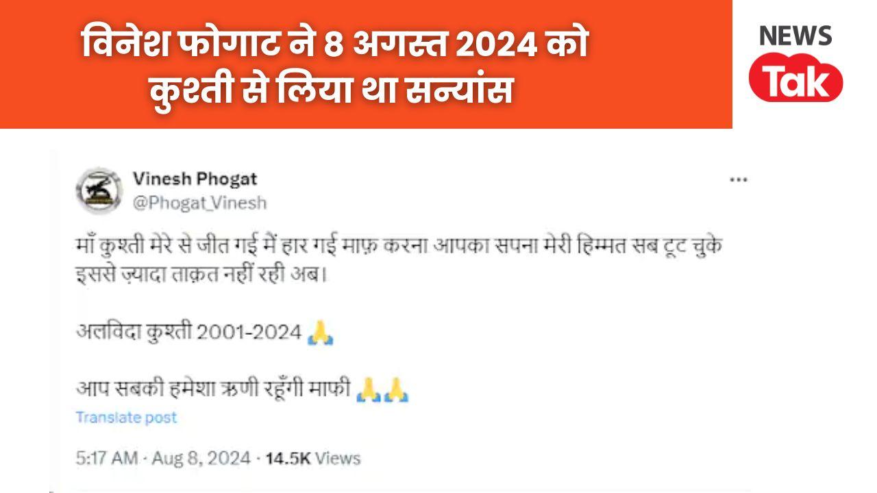 विनेश पेरिस ओलंपिक 2024 में फाइनल तक पहुंची थीं. लेकिन 100 ग्राम वजन ज्यादा होने से डिसक्वालिफाई हो गईं. इसके बाद उन्होंने कुश्ती छोड़ने का ऐलान किया था.