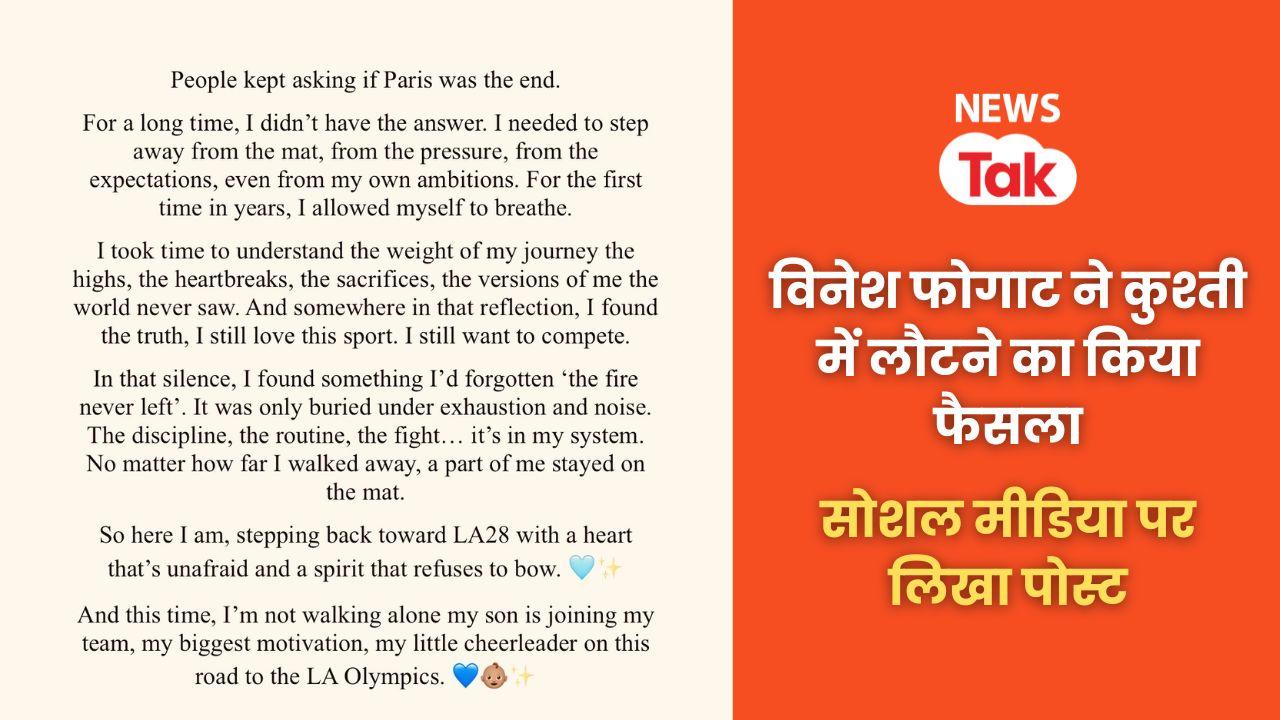 अपने संन्यास वापस लेने की घोषणा करते हुए विनेश ने लिखा कि लोग अक्सर पूछते थे कि क्या पेरिस उनका आखिरी मुकाबला था. उन्होंने बताया, "बहुत समय तक, मेरे पास इसका जवाब नहीं था. मुझे मैट से, प्रेशर से, उम्मीदों से, यहां तक कि अपने सपनों से भी दूर जाने की जरूरत थी. सालों में पहली बार, मैंने खुद को सांस लेने दिया. मुझे अपने सफर का महत्व समझने में समय लगा. उतार-चढ़ाव, दिल टूटना, त्याग, मेरे वो रूप जिन्हें दुनिया ने कभी नहीं देखा और कहीं उस सोच में, मुझे सच मिला, मुझे अब भी यह खेल पसंद है. मैं अब भी मुकाबला करना चाहती हूं."